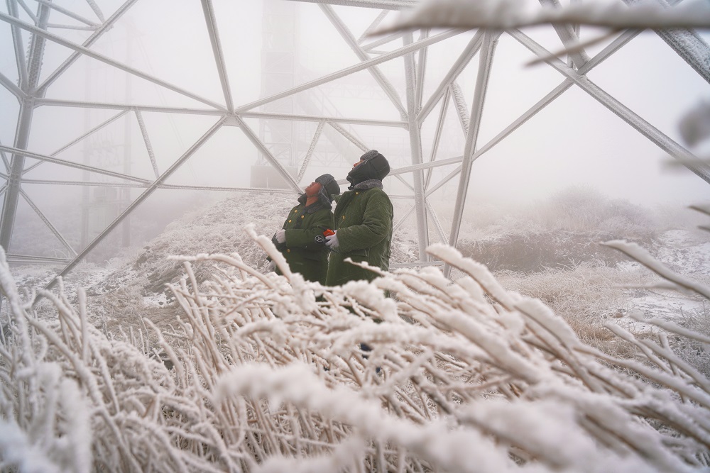 12月12日,國網(wǎng)運城供電公司員工在110千伏金古線固定觀冰哨開展線路覆冰觀測。